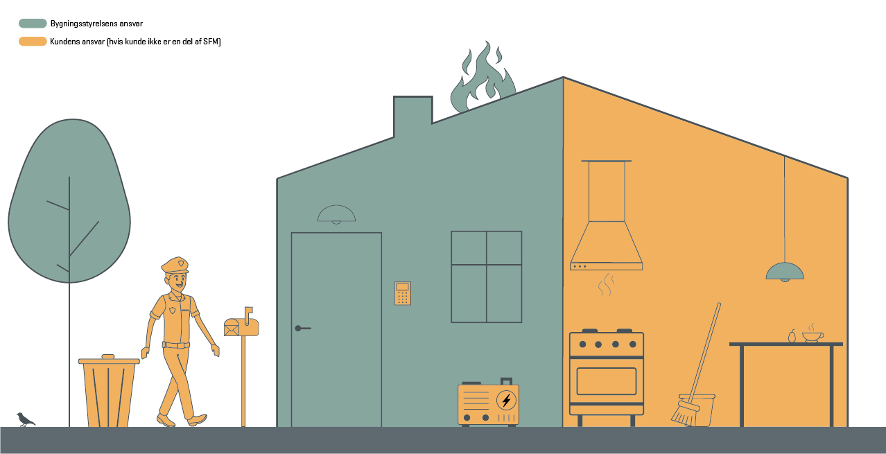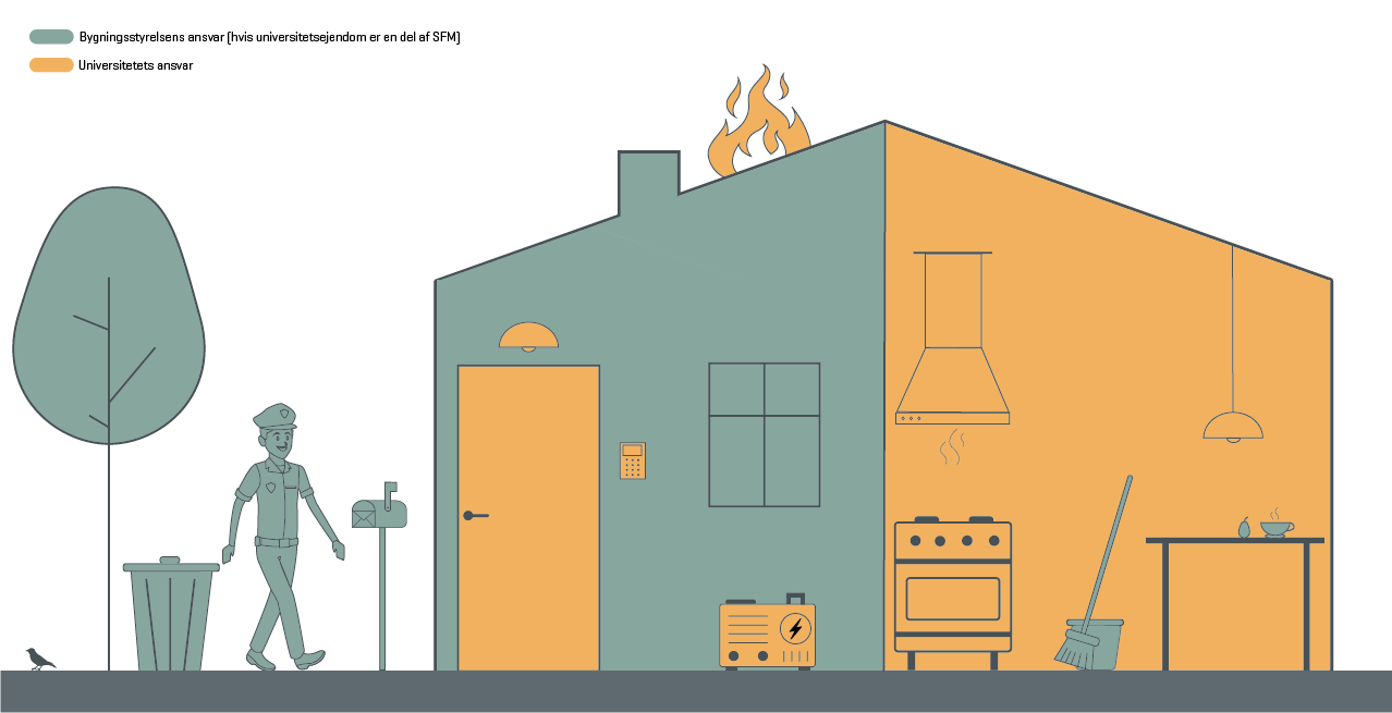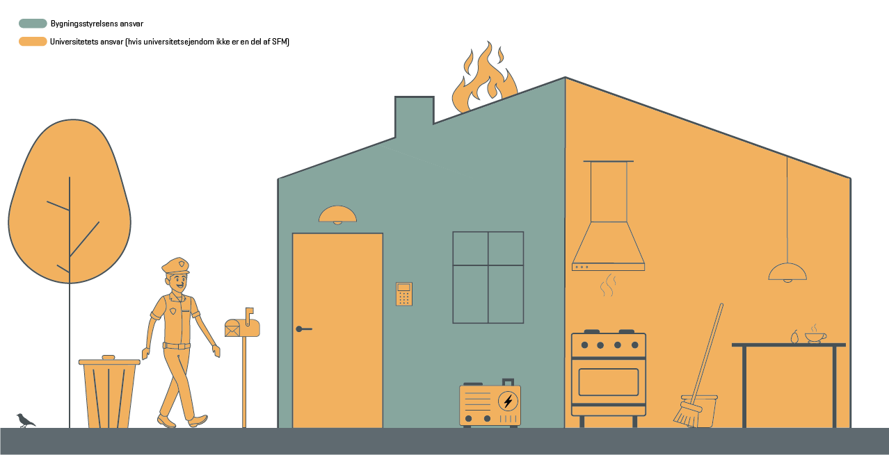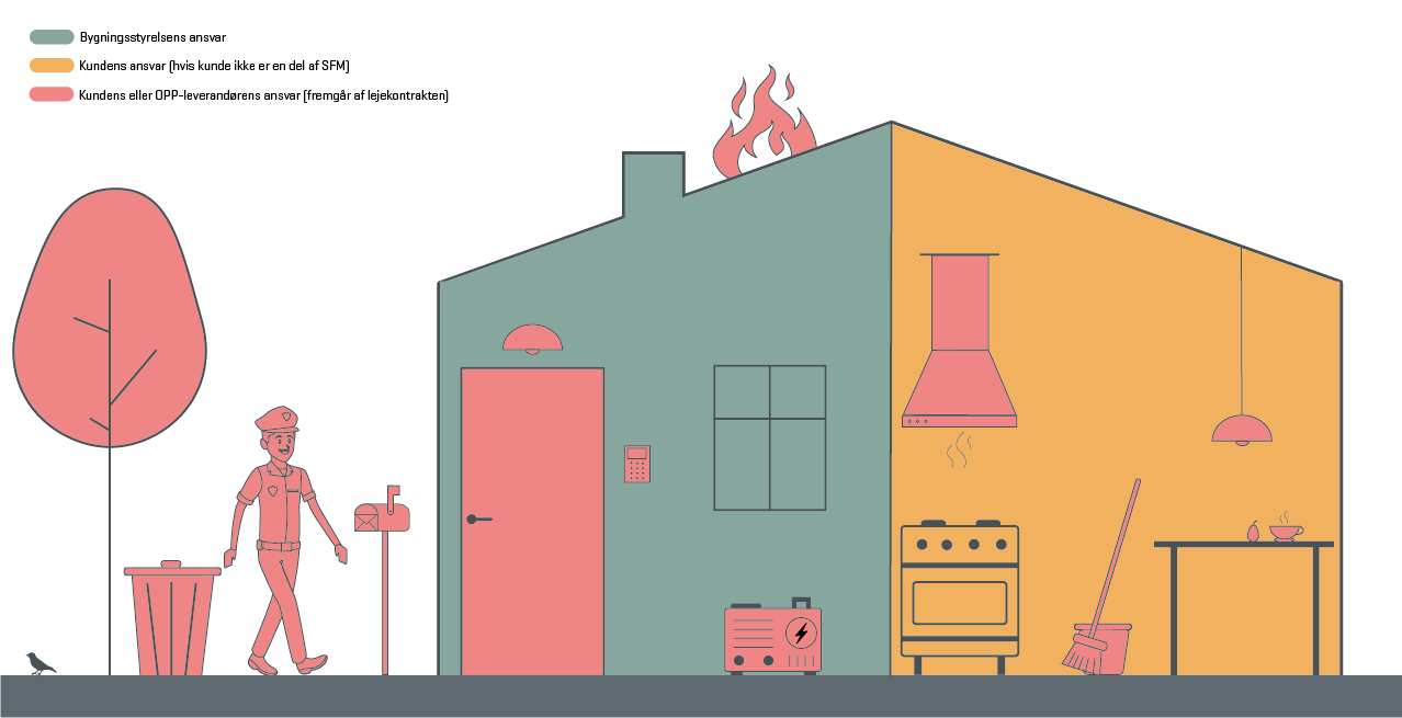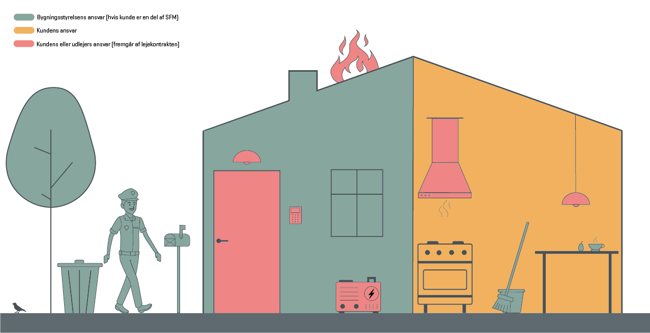 Bygningsstyrelsen har ansvaret for forholdsordren relateret til akut skadesudbedring samt alarmer fra bygningstekniske basisinstallationer såsom CTS, lækagesikring, ABA-anlæg, elevator osv..