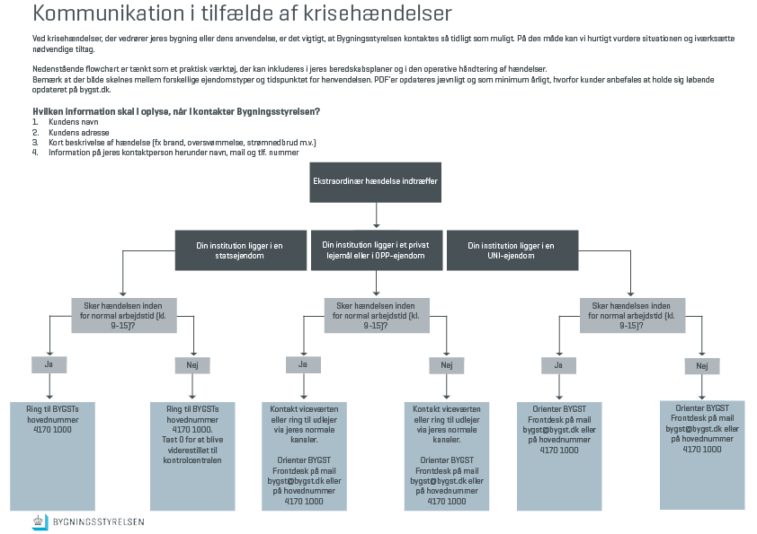 Ved krisehændelser, der vedrører jeres bygning eller dens anvendelse, er det vigtigt, at Bygningsstyrelsen kontaktes så tidligt som muligt.